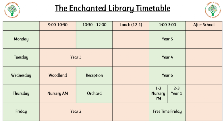 Every child has the opportunity to visit The Enchanted Library once a week in a timetabled slot. The Enchanted Library houses a huge range of fiction, non-fiction, poetry and plays and helps our children develop a true love of reading.